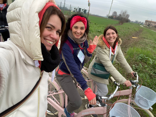 The day started with a cheerful group bike ride in the countryside around the Soliera Headquarters, riding pretty vintage bicycles, then left as a gift to the (in) experienced cyclists. A nice cloud of pink bicycles in motion to remind the importance of moving together, actively and sustainably, to fight all forms of gender-based violence.